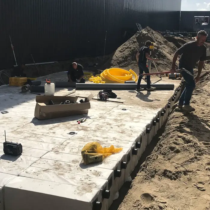 - Laying the blocks on a 100mm layer of sand aids infiltration from the module into the surrounding soil and the discharge of water.