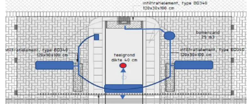 In the each sub-array, three or four BD 340 blocks were used at a depth of 1300mm. These were arranged to the side of the tree under the existing parking spaces, with another block directly in front of the tree. The blocks were connected to ensure fast filling of the sub-array.